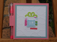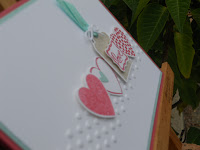 I also got to use some more of the SAB benefits (the Pool Party Ribbon) and the wee “Love” sentiment is from the Ciao, Baby! stamp set and cut out with the Petite Curly Label Punch available free with SAB and a $100 purchase. The hearts and tag sit on the embossed area on dimensionals.