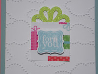 I also got to use some more of the SAB benefits (the Pool Party Ribbon) and the wee “Love” sentiment is from the Ciao, Baby! stamp set and cut out with the Petite Curly Label Punch available free with SAB and a $100 purchase. The hearts and tag sit on the embossed area on dimensionals.