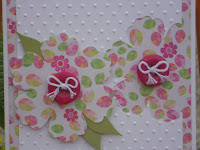 I made a couple of changes in that I did not have as may layers and I also made the embossed inset slightly smaller. Got to use a stack of buttons too. changed the leaves on some as well….can’t have 2 cards the same now can I??? For those of you who have not seen this done before, the embossed panel is punched with the blossom punch and then a matched flower from the DSP is placed offset to this one and on dimensionals. This pic may explain it a little better…….