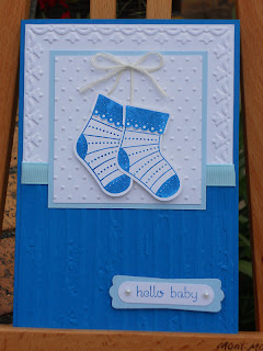 Some time back I was asked to make a baby boy card for one of the doctors at work who was about to become and Aunty. I was also HANGING out to try and make the booties I had seen around blog land with the Stocking Punch. I took my inspiration from here and here. Given that I wanted to give her a choice, I made a softer card and one a bit bolder.