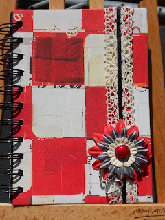 The things I carried through all the notebooks are the flower motif and the wee double heart charm. the lace was all the same, but I added another narrow contrast ribbon to make it pop. The flowers (I thought anyhow) looked fantastic. Sadly I did not have any black paper flowers so I tried to colour a white one with ink….and nearly got there.