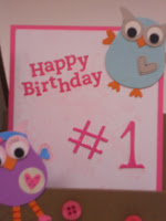 Now (again) one of the doctors at work, well his niece was turning 1 and she is MAD about all things Hoot….to the point where her party was totally Hoot themed!!! He asked if I could make her a special card. I immediately thought of Katie’s effort. This is what I came up with…..