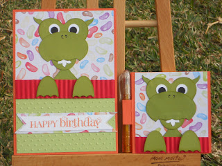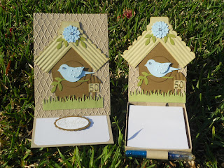 The idea I had in mind was this FAB and super cute Bird House post it holder by Cynthia Richards. I downloaded the tute and started to work. Essentially it is easy peasy to put together, the only real modification I made was at the base with adding a Round Tab Punch to help it sit up a little better. I also added a wee slip for the pen to go to through at the base. Given the gift was based around an easel format, I made a matching card too. Here are the two together…….