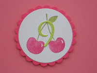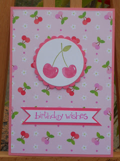 I immediately thought of the wee cherry stamp I had at home and the mojo flowed from there. I made 3 cards, picking up the colours from the paper. These are the cards….
